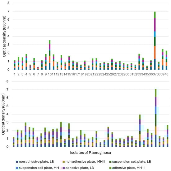 Regarding the cumulative results of the biofilm assay, P. aeruginosa can be divided into two groups. The biofilm-forming ability of the first group is influenced only by temperature and medium quality. In contrast, the other group consisted of those isolates whose biofilm-forming ability was not only influenced by temperature and medium quality, but also by the adhesion properties of the applied tissue culture plate.