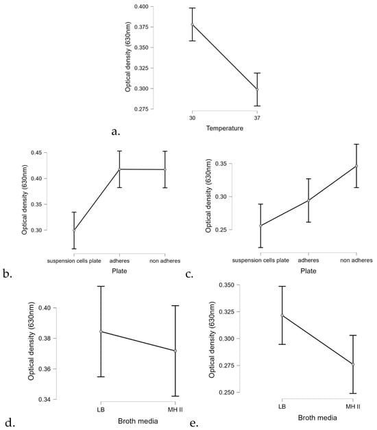 Marginal effects of (a) temperature, plate quality at different temperatures (b) 30 °C and (c) at 37 °C, and the applied broth media at different temperatures (d) at 30 °C and (e) at 37 °C on biofilm formation of the 40 tested P. aeruginosa isolates.