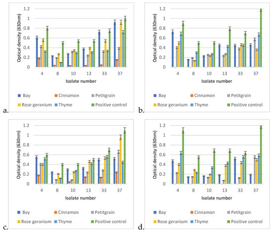 One-way ANOVA was used to determine whether there was a significant difference between the individual essential oils and their concentrations, as well as the temperatures applied, in the biofilm-forming ability of different isolates. Post hoc analysis was then used to detect differences using Tukey’s test. In both cases, p < 0.05 was the significance threshold.