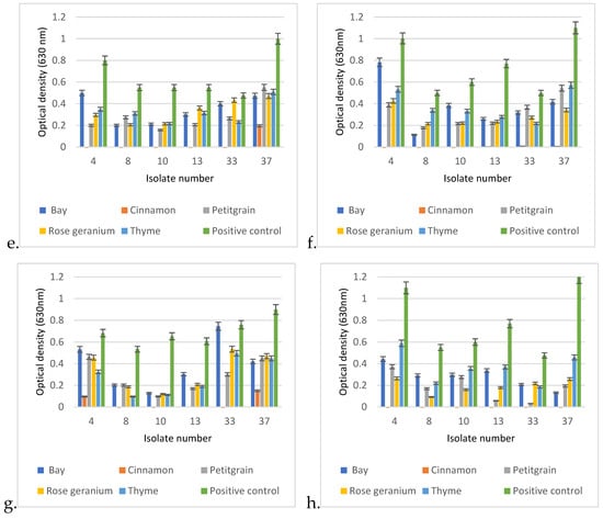 Biofilm degradation capacities of the 5 tested EOs under different exposure conditions on established biofilms of otitis externa P. aeruginosa isolates 4, 8, 10, 13, 33, and 37. The degradation conditions were given in the following order: applied EO concentration, exposure time, applied temperature. Based on this, the graphs represent the following exposure conditions: (a) 0.25%, 1 h, 30 °C; (b) 0.25%, 24 h, 30 °C; (c) 0.5%, 1 h, 30 °C; (d) 0.5%, 24 h, 30 °C; (e) 0.25%1 h, 37 °C; (f) 0.25%, 24 h, 37 °C; (g) 0.5%, 1 h, 37 °C; (h) 0.5%, 24 h, 37 °C.