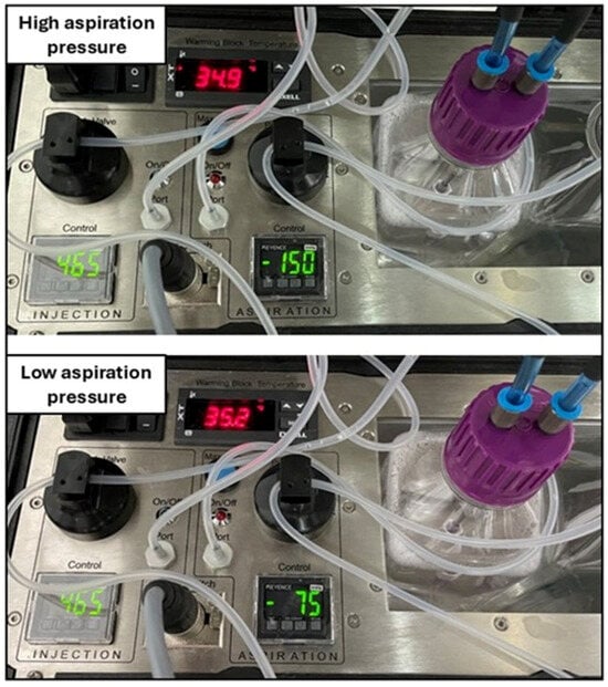 Experiment 1: The effect of aspiration pressure on oocyte recovery and in vitro embryo production was determined. Two aspiration pressure groups were created (Figure 2): high pressure (150 mmHg and 1.33 mL/s flow rate, n = 18 mares) and low pressure (75 mmHg and 0.75 mL/s flow rate, n = 18 mares). The flow rate was calculated by placing the OPU needle tip in a falcon tube filled with the flushing medium and measuring the time taken to aspirate 50 mL of the media. The pump was always placed at the same location (approximately 30 cm below the mare’s vulva). For each OPU session, the aspiration group (high or low) was alternated in sequential order for the following mares of the OPU session. The rest of the OPU parameters were kept constant (injection pressure of 465 mmHg, and needle rotation). The injection pressure used (465 mmHg) and the needle twisting during follicle flushing were similar in both groups.