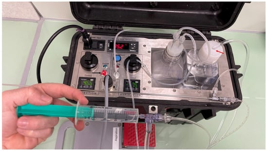 Experiment 2: The effect of the flushing method (manual vs. injection pump) on oocyte recovery was investigated. The same aspiration and injection pump (Minitube aspiration and flushing pump for equine OPU, 230 V, MInitube Ibérica, Tarragona, Spain) was used for both groups. However, in the manual injection group (n = 18), the injection port of the pump was disabled by covering the exit port with plastic tape (Figure 3); instead, a 20 mL rubber-free plastic syringe connected to a three-way automatic valve (controlled flushing set, Mila International, Florence, KY, USA) was used as the injection method to flush follicles. This method allowed refilling of flushing media and injection into the follicle via the syringe and tubing system, with a variable volume of injected medium according to follicle size (0.5 mL to 5 mL for follicles of 3 to >25 mm). The syringe was managed by a different operator. In the injection pump group (n = 18), the injection port was used as recommended by the manufacturer, using a constant injection rate (465 mmHg, injection flow rate of 1 mL/s) activated with a foot pedal. The injection pedal was activated until the follicle expanded to its original size. The aspiration pressure (75 mmHg flow rate of 0.75 mL/s) and the rest of the variables (needle twisting) were kept constant for both experimental groups.