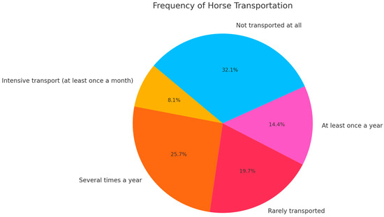 Regarding horse transportation, 8.1% of the surveyed horses were transported at least once a month, while 25.7% were moved several times a year. Horses that were rarely transported accounted for 19.7%, and those transported at least once a year constituted 14.4%. A significant portion (32.1%) were not transported at all (Figure 1).