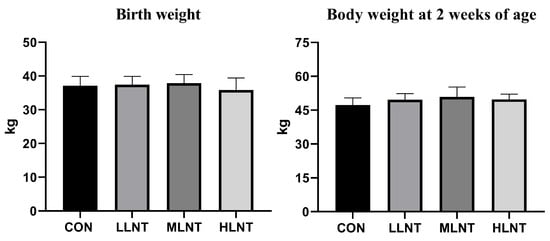 The test results indicated no statistically significant difference in calf birth weight between the control group and each treatment group. Furthermore, no significant differences were observed in calf weights among groups after two weeks of life (Figure 1).