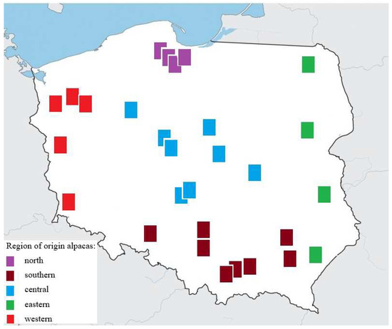Animals were divided into groups according to sex, age, region of origin, and the time of year in which the study was carried out. Faeces were collected from all alpacas on the farm. The body weight of the animals ranged from 6.5 kg (cria) to 75 kg (adult males). Fifty alpacas were housed in farms located in the north of Poland, 154 in the southern part, 100 in the central part, 177 in the eastern part, and 31 in the western part.
