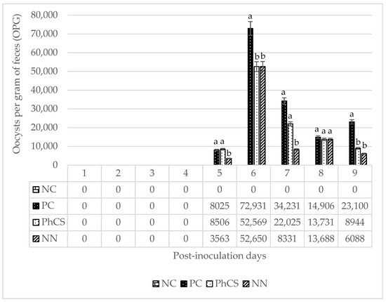 Fecal oocyst excretion per gram of feces (OPG) of Eimeria spp. from day 5 to 9 post-inoculation. Within each day, mean values with columns labeled with different letters differ significantly at p < 0.05. NC: negative control; PC: positive control; PhCS: phytogenic supplement; NN: anticoccidials (narasin and nicarbazin). Error bars represent a ±5% error. OPG: oocysts per gram of feces.
