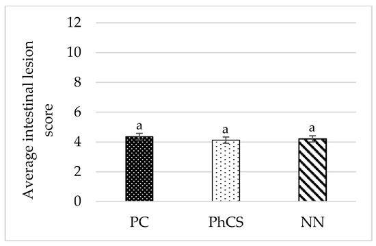 Average intestinal lesion score at 9 days post-inoculation. Mean values with columns labeled with the same letter do not differ significantly (p > 0.05). PC: positive control; PhCS: phytogenic supplement; NN: anticoccidials (narasin and nicarbazin). Error bars represent a ±5% error.