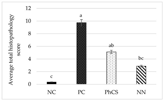 As expected, the NC group did not present microscopic lesions at day 9 post-inoculation (Figure 3, Table 2). The lesions observed in the PC group were significantly greater than those detected in the NC and the NN groups (p < 0.05). The PhCS group obtained an intermediate average total histopathology score (5.125/12) (Figure 3, Table 2), with no significant differences compared to either the PC (9.75/12) or NN (2.875/12) (p > 0.05).