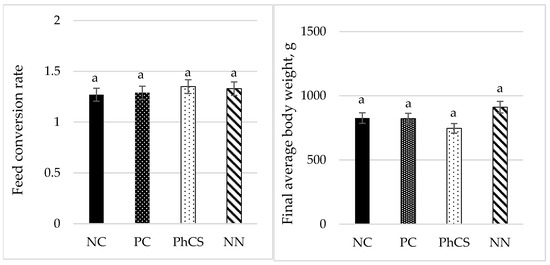 Final body weight and feed conversion rate at 9 days post-inoculation. Mean values with same letters differ significantly (p < 0.05). NC: negative control; PC: positive control; PhCS: phytogenic supplement; NN: anticoccidials (narasin and nicarbazin). Error bars represent a ±5% error.