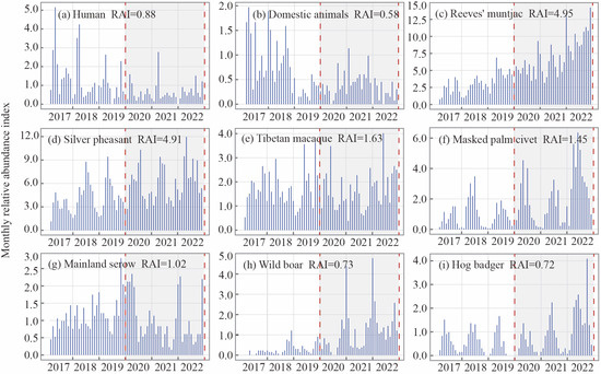 Trends in the monthly relative abundance of these seven species over 6 years were analyzed, with humans and domestic animals similarly included in the statistics. The results showed that the peak activity of most focal species occurred during the pandemic (Figure 2).