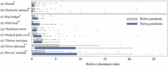 Differences in the relative abundance index (RAI) of human, domesticated animals, and focal species before and during the pandemic. * p < 0.05; ** p < 0.01.