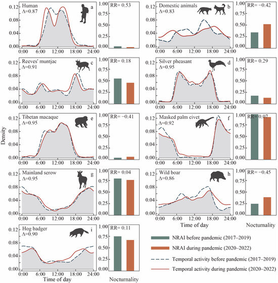 Activity pattern differences of humans (a), domestic animals (b), and the focal species surveyed in this study (c–i). For each species, the overlap (Δ) of temporal activity between the pre-pandemic (green dashed line) and pandemic (red solid line) periods is shown on the left, while the night-time relative abundance index (NRAI) and risk ratio (RR) between the pre-pandemic (green bar) and pandemic (red bar) periods are shown on the right.