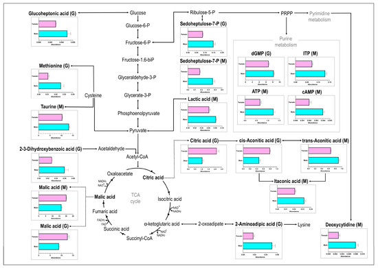 The metabolite response of female (top bar in pink) and male (bottom bar in blue) geoduck, Panopea zelandica, detected in gill (G) and muscle (M) tissue, reported as average metabolite abundance distributed amongst different metabolite pathways.