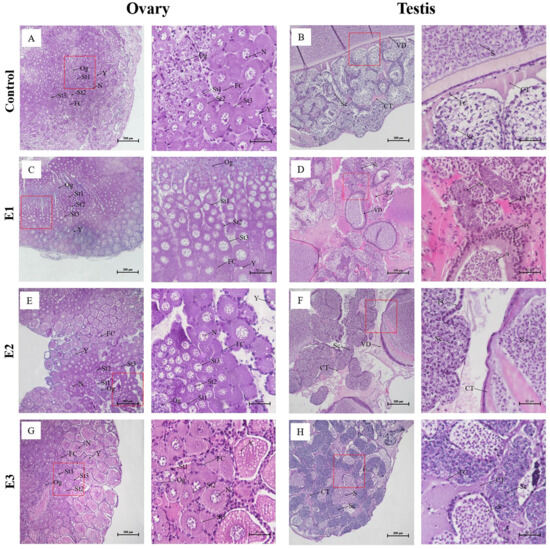 - Martinez-Bengochea, A.; Doretto, L.; Rosa, I.F.; Oliveira, M.A.; Silva, C.; Silva, D.M.Z.A.; Nóbrega, R.H. Effects of 17β-estradiol on early gonadal development and expression of genes implicated in sexual differentiation of a South American teleost, Astyanax altiparanae. Comp. Biochem. Physiol. Part B Biochem. Mol. Biol. 2020, 248, 110467. [Google Scholar] [CrossRef]