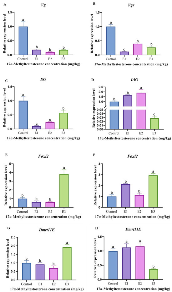 - Lyu, Q.; Hu, J.; Yang, X.; Liu, X.; Chen, Y.; Liao, L.; Zhao, H. Expression profiles of dmrts and foxls during gonadal development and sex reversal induced by 17α-methyltestosterone in the orange-spotted grouper. Gen. Comp. Endocrinol. 2019, 274, 26–36. [Google Scholar] [CrossRef]