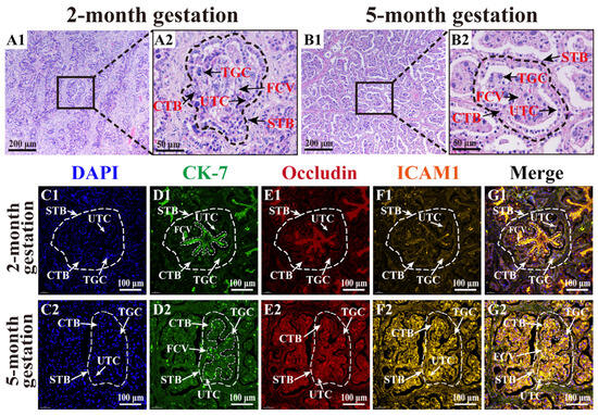 H&E staining results at two months of gestation revealed that the chorion extended villi while forming folds, with primary villi progressively branching into shorter secondary villi with sparse blood vessels in the villous stroma (Figure 1(A1)). At this stage, the trophoblast was structured into inner cytotrophoblast (CTB) and outer syncytiotrophoblast (STB) layers, with abundant trophoblast giant cells (TGCs) and uninucleate trophoblast cells (UTCs) distributed throughout the tissue (Figure 1(A2)). At five months of gestation, the placental STB and CTB showed clear demarcation and vacuolated structures. The volume of the fetal cotyledonary villus (FCV) was significantly increased through branching into secondary/tertiary villi, enhancing the maternal–fetal interface, and a dense capillary network was observed in the villous stroma (Figure 1(B1)). The nuclei of UTCs appeared round or oval upon light staining, whereas those of multinucleated TGCs were larger and more intensely stained (Figure 1(B2)). The IF results revealed clearly defined DAPI-labeled nuclei in the placental tissues of both groups (Figure 1C). Compared with the two-month gestation group, the five-month gestation group exhibited significantly increased fluorescence intensity of the TC marker CK-7, tight junction protein occludin, and adhesion molecule marker ICAM1 (Figure 1D–F). The co-localization results showed that CK-7, occludin, and ICAM1 were widely expressed in FCV and co-localized in the cytoplasm of both TGCs and UTCs (Figure 1G). These findings highlight the dynamic structural changes that occur in the placenta during early and middle pregnancy, particularly during TC invasion and differentiation. The upregulation of occludin and ICAM1 underscores the critical role of cell adhesion and junction formation in TC invasion and differentiation.
