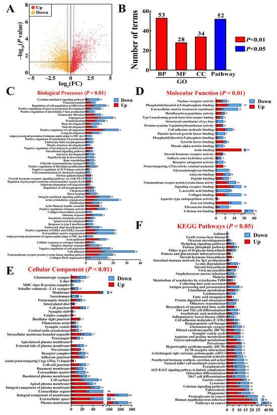 Summary of proteome analysis and protein identification and annotation results from DIA analysis. (A) Volcano plot of 1622 DEPs, including 836 upregulated and 786 downregulated DEPs. (B) Summary of GO terms for biological processes (BP), molecular functions (MF), cellular components (CC) (p < 0.01), and pathway annotation (p < 0.05). (C–F) GO annotation results for BPs, MFs, and CCs, along with pathway annotation.