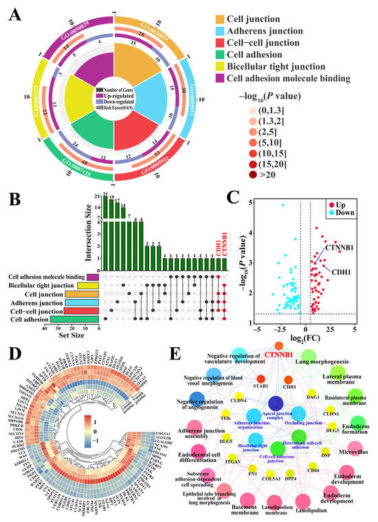 Identification of candidate DEPs related to cell adhesion and junction formation based on GO enrichment data. (A) Candidate DEPs and GO terms. (B) UpSet–Venn diagram of six GO terms and 103 DEPs. (C) Volcano plot of 103 DEPs, including 54 downregulated and 49 upregulated DEPs. (D) Heatmap of 103 candidate DEPs. (E) Interactive relationship analysis of candidate DEPs and GO terms performed using ClueGO.