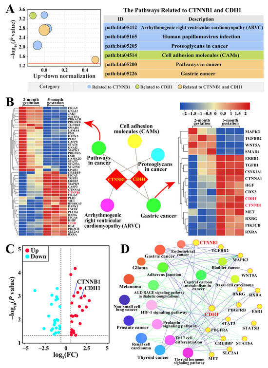 Pathways involving CTNNB1 and CDH1 were selected to identify their potential roles in cell adhesion and junction formation in yak placental tissues at two and five months of gestation (Figure 4). Six pathways, including cell adhesion molecules, arrhythmogenic right ventricular cardiomyopathy, proteoglycans in cancer, pathways in cancer, human papillomavirus infection, and gastric cancer, were identified by DIA proteomic analysis. Among these, gastric cancer and pathways in cancer were the two key pathways associated with CTNNB1 and CDH1 (Figure 4A, Table S7). The interaction network of these two pathways suggests that CTNNB1 is involved in four pathways, whereas CDH1 is involved in three. The DEPs associated with the two key pathways were significantly differentially expressed between the two-month and five-month gestation groups (Figure 4B). A total of 48 candidate DEPs, including 23 downregulated and 25 upregulated DEPs, were identified within these two pathways (Figure 4C). ClueGO analysis indicated that 16 of the 48 DEPs were directly related to 17 pathways, with CTNNB1 and CDH1 involved in eight pathways related to cell adhesion and junction formation and seven cancer-related KEGG pathways, respectively (Figure 4D). These findings suggest that CTNNB1 and CDH1 may regulate placental development during pregnancy, likely through their involvement in cell adhesion and junction formation, as well as cancer-related pathways.