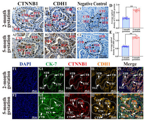 Positive expression of CTNNB1 and CDH1 was observed in the FCV and cytoplasm of TCs at both two and five months of gestation (Figure 5A,B). In the two-month gestation group, CTNNB1 and CDH1 were detected in UTCs and TGCs and sparsely detected in FCV (Figure 5(A1,B1)). The staining intensity of CTNNB1 and CDH1 was enhanced at five months of gestation in UTCs, TGCs, and FCV (Figure 5(A2,B2)). No positive staining for CTNNB1 or CDH1 was observed in the negative control group (Figure 5(C1,C2)). IOD analysis revealed significantly upregulated expression of CTNNB1 and CDH1 in the five-month gestation group compared to that in the two-month gestation group (p < 0.01) (Figure 5D,E). The IF results revealed clearly defined nuclei labeled with DAPI in placental tissues at both two and five months of gestation (Figure 5F). The fluorescence intensity of CK-7 was significantly higher at five months of gestation than at two months of gestation (Figure 5G). Positive fluorescence signals for CTNNB1 and CDH1 were present in the cytoplasm of TGCs and UTCs in both two-month and five-month gestation groups, with stronger signal intensity in the latter group (Figure 5H,I). The co-localization results indicated that CK-7, CTNNB1, and CDH1 were co-localized in the cytoplasm of TGCs and UTCs (Figure 5J). These findings highlight the upregulated expression of CTNNB1 and CDH1 and their cooperative roles in TC adhesion and junction formation during pregnancy.