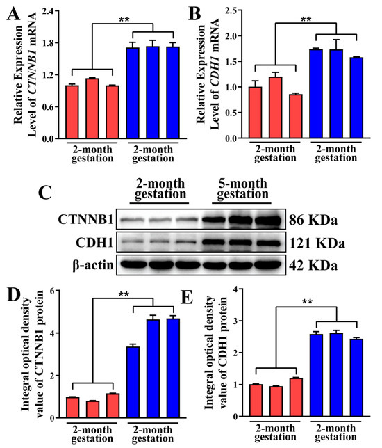 To further investigate the impact of placental TC adhesion and junction formation on pregnancy, the relative expression levels of CTNNB1 and CDH1 mRNA and protein were evaluated in yak placental tissues using qPCR and Western blot (Figure 6). Compared to the two-month gestation group, the five-month gestation group showed significantly upregulated relative mRNA expression levels of CTNNB1 and CDH1 (p < 0.01) (Figure 6A,B). Moreover, CTNNB1 and CDH1 protein expressions were present but were different in each sample of the two groups (Figure 6C). IOD values indicated that CTNNB1 and CDH1 expressions were significantly higher in the five-month gestation group than in the two-month gestation group (p < 0.01) (Figure 6D,E). Overall, these findings suggest that CTNNB1 and CDH1 may play critical roles in maintaining placental structure and function, and that their upregulation is strongly correlated with TC adhesion and junctional integrity in the placenta.