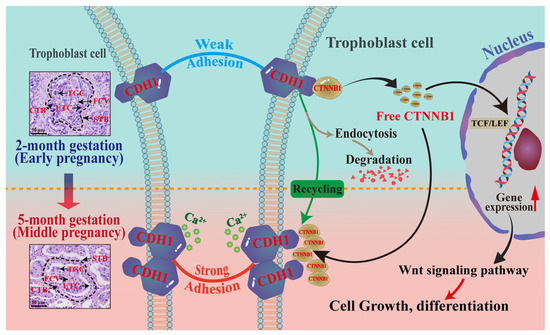 Based on these results and those of previous studies, we propose a potential mechanism underlying the roles of CTNNB1 and CDH1 in pregnancy (Figure 7). During pregnancy, TCs in the placenta undergo key adhesion changes, transitioning from weak to strong intercellular adhesions to appropriate invasion and subsequent stabilization, which are essential for placental development [12,34]. Specifically, early in pregnancy, limited CDH1 expression results in weaker adhesion between TCs, promoting their migration into and invasion of the uterine lining [12,50]. CTNNB1 was internalized and degraded, further reducing adhesion strength [51]. As pregnancy progresses to mid-pregnancy, the increased CDH1 and CTNNB1 expression enhance adhesion by forming stable CTNNB1–CDH1 complexes aided by calcium ions (Ca2+) [37]. Additionally, recycling of CTNNB1 to the cell membrane further strengthens adhesion, providing stability to the developing placenta [38]. Free CTNNB1 can also activate the Wnt signaling pathway, promoting TC growth and differentiation [39]. Therefore, the dynamic regulation of CTNNB1/CDH1 is crucial for maintaining the balance between TC invasion and stable adhesion during placental development.