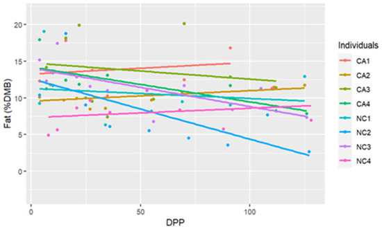 The trendlines and values of milk percent fat concentrations (dry matter basis, DMB) among eight individual horses from 4 to 130 days post-parturition (DPP) at two housing locations (California Polytechnic State University (CA) = 4 and North Carolina State University (NC) = 4) (n = 85 milk samples, ANCOVA, p < 0.05).