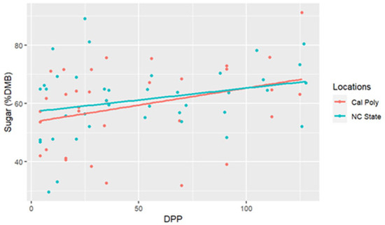 Percent sugar concentrations (dry matter basis, DMB) of California Polytechnic State University (Cal Poly) and North Carolina State University (NC State) mares’ milk from 4 to 130 days post-parturition (DPP) with associated regression lines (Cal Poly = 4, NC State = 4) (n = 85 milk samples, ANCOVA, p > 0.05).