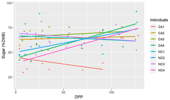 The trendlines and values of milk percent sugar concentrations (dry matter basis, DMB) among eight individual horses from 4 to 130 days post-parturition (DPP) at two housing locations (California Polytechnic State University (CA) = 4 and North Carolina State University (NC) = 4) (n = 85 milk samples, ANCOVA, p < 0.05).