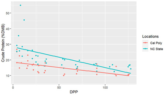 Percent crude protein concentrations (dry matter basis, DMB) of California Polytechnic State University (Cal Poly) and North Carolina State University (NC State) mares’ milk from 4 to 130 days post-parturition (DPP) with associated regression lines (Cal Poly = 4, NC State = 4) (n = 85 milk samples, ANCOVA, p < 0.05).