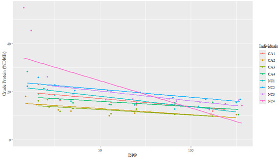 The trendlines and values of milk percent crude protein concentrations (dry matter basis, DMB) among eight individual horses from 4 to 130 days post-parturition (DPP) at two housing locations (California Polytechnic State University (CA) = 4 and North Carolina State University (NC) = 4) (n = 85 milk samples, ANCOVA, p > 0.05).
