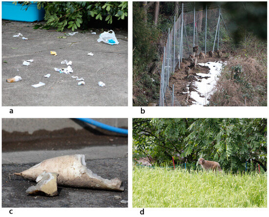 The presence of Japanese macaques in inhabited areas creates numerous challenges, particularly regarding the safety of residents and the protection of cultivated land [19,24,66]. Damage caused by macaques is increasing in human environments, including property destruction and intrusions (Figure 2a), as well as personal injuries reported in various regions [23,25,26]. Notably, this was observed in Yamaguchi in 2022, raising growing concerns among residents about the escalating impact of macaques.