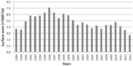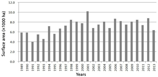 Evolution of the area of crop damage caused by Japanese macaques (in thousands of hectares). Modified figure from the Japanese Ministry of the Environment (Depret et al., 2023 [25]).