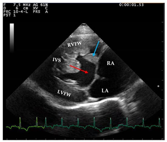 Right parasternal long axis view from a 2-year-3-month-old domestic shorthair neutered male cat. A large ventricular septal defect can be observed (red arrow); the tricuspid valve is severely thickened (blue arrow). Severe hypertrophy of the right ventricular free wall, moderate hypertrophy of the left ventricular wall, and right atrial dilation are present. RVFW—right ventricular free wall, IVS—interventricular septum, LVFW—left ventricular free wall, RA—right atrium, LA—left atrium.