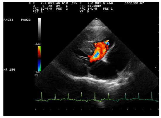 Right parasternal long axis view from a 2-year-3-month-old domestic shorthair neutered male cat. Color Doppler interrogation at the level of the ventricular sept defect identified a left-to-right flow.