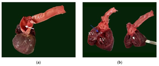The heart was significantly enlarged (organ weighed 37 g, representing 1.12% of total body weight) with prominently thickened, ventricular walls (bilateral ventricular hypertrophy). Originating from the base of the heart, a single large arterial trunk (PTA) (measuring 0.8 cm) with its ventricular outflow tract was observed (Figure 4). At 0.5 cm from its origin, the PTA gave rise to the pulmonary artery, which subsequently branched into the right and left pulmonary arteries. Under the arterial trunk, within the upper segment of the interventricular septum a large and non-restrictive septal defect measuring 1.2 cm was observed. Due to all the identified features, the single large arterial trunk was identified as a persistent truncus arteriosus type 1 (Figure 5a,b).