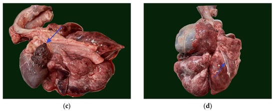 In addition to the cardiac abnormalities, the evaluation of the thoracic cavity revealed a pulmonary pleural anomaly characterized by an abnormal pleural insertion at the level of the right middle lung lobe. This abnormality was observed as a fibrous, transparent membrane in direct contact with both the thoracic wall and the pulmonary lobe and was not accompanied by significant lung fibrosis (Figure 5d).
