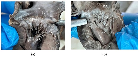 Gross appearance of formalin-fixed heart: (a) Left heart—mitral valve with an appearance characteristic to myxomatous degeneration, the valve appears thickened and nodular, and chordae tendineae were also thickened. (b) Right heart—tricuspid valve with an incipient stage of myxomatous degeneration, thickened chordae tendineae, supernumerary and hypertrophied papillary muscles. LA—left atrium, LV—left ventricle, M-v—mitral valve, c-t—chordae tendineae, p-m—papillary muscles, RA—right atrium, RV—right ventricle, T-v—tricuspid valve.