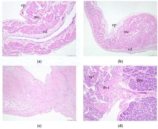 Histological features: (a) Left atrial divertculum presented a very thin aspect around its apex with a diameter reaching 136.56 μm, H&E stain, ob × 20. (b). Transition from the left atrial wall to the diverticulum, with thinning of the wall (from 936.26 μm to 304.97 μm), especially of the myocardium (from 771.78 μm to 190.01 μm) and endocardium (142.14 μm to 51.76 μm), H&E stain, ob × 10. (c) The mitral valve was presenting a myxomatous degeneration characteristic aspect, the spongiosa appeared thickened, while loosely arranged fibrous connective tissue were markedly disrupting and replacing the fibrosa, H&E stain, ob × 10. (d) Splenopancreatic fusion—the spleen and the pancreas are strongly bounded and intertwined through a fibrous component. The fibrous bridge spread through the splenic and pancreatic parenchyma, which conferred continuity between the two organs, H&E stain, ob × 20. A&D: Scale bar = 100 μm. B&C: Scale bar = 200 μm. ep—epicardium, mc—myocardium, ed—endocardium, spl—spleen, pnc—pancreas, fb-t—fibrous tissue.