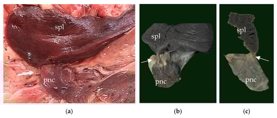 The splenopancreatic fusion: (a) the gross aspect of the splenopancreatic fusion (white arrow). (b) The formalin-fixed appearance of the fusion (white arrow). (c) A longitudinal section of the splenopancreatic fusion (white arrow). spl—spleen, pnc—pancreas.