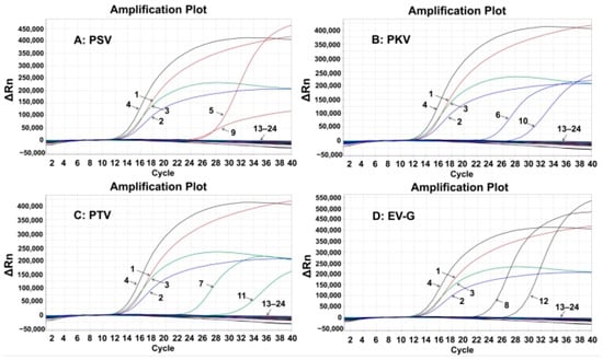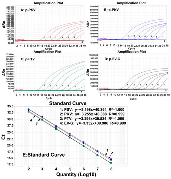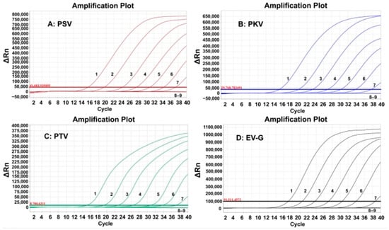 The sensitivity of the developed quadruplex RT-qPCR was evaluated using the synthesized viral RNAs. The mixtures of synthesized viral RNAs of PSV, PKV, PTV, and EV-G with concentrations from 1.0 × 108 to 1.0 × 101 copies/ (the final concentration: 1.0 × 107 to 1.0 × 100 copies/). The results indicated that the LODs were 1.0 × 101 copies/ for all four synthesized viral RNAs (Figure 3).