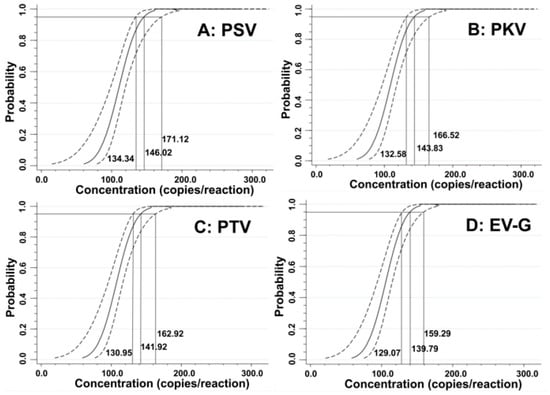 The LODs were also assessed using probit regression analysis. The concentrations of 500, 250, 125, and 62.5 copies/reaction for the synthesized viral RNAs of PSV, PKV, PTV, and EV-G were selected as templates (Table 3). The results showed that PSV, PKV, PTV, and EV-G had LODs of 146.02 (95% confidence interval (CI) of 134.34–171.12), 143.83 (95% CI of 132.58–166.52), 141.92 (95% CI of 130.95–162.92), and 139.79 (95% CI of 129.07–159.29), respectively (Figure 4), indicating high sensitivity of the quadruplex RT-qPCR.