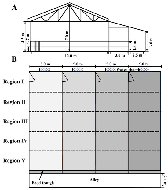 Schematic view of the experimental pens. (A) the side view of the barn. (B) the top view of the barn. The areas with colors ranging from light to dark represent SD, FMM, FSD, and FST, respectively. SD = sawdust; FMM = fermented manure mixture; FSD = fermented manure and sawdust; FST = fermented manure and straw.