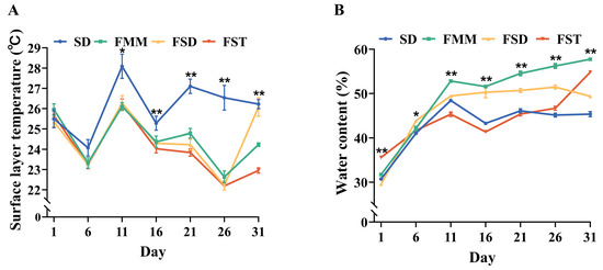 The microenvironment of four bedding groups. (A) surface layer temperature and (B) water content of beddings. * p ˂ 0.05 and ** p ˂ 0.01. SD = sawdust; FMM = fermented manure mixture; FSD = fermented manure and sawdust; FST = fermented manure and straw.