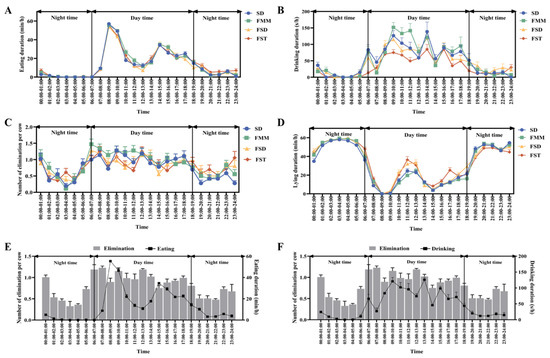 The circadian rhythm of heifer behaviors. Daytime is set from 06:00 to 19:00; the rest of the time is nighttime. (A) eating duration, (B) drinking duration, (C) numbers of elimination, (D) lying duration, (E) correlations of elimination and eating, and (F) correlations of elimination and drinking. SD = sawdust; FMM = fermented manure mixture; FSD = fermented manure and sawdust; FST = fermented manure and straw.