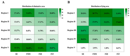 Distribution of eliminative and lying regions. Each pen was equally divided into five regions, namely regions I, II, III, IV, and V, from the water slot side to the food trough side. (A) distribution of eliminative area; (B) distribution of lying area. SD = sawdust; FMM = fermented manure mixture; FSD = fermented manure and sawdust; FST = fermented manure and straw.