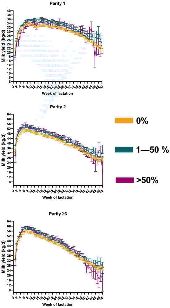 Estimated marginal means showing the average daily milk yield (kg/d) over the course of 50 weeks from 194,142 daily cow observations of 1573 dairy cows exhibiting a bimodal milk flow curve in 0, 1–50%, and >50% of milking observations per day stratified by parity. Error bars show 95% confidence intervals.