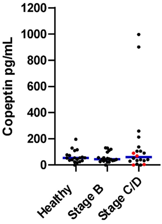 Copeptin hormone concentrations in healthy dogs, preclinical (Stage B) heart disease dogs, and congestive heart failure (Stage C/D) dogs. Stage D dogs are depicted by the red dots. The blue horizontal line represents the median value for each group. There was no significant difference between groups (p = 0.76).
