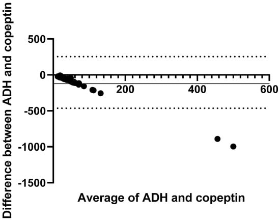 Relative to ADH, copeptin showed poor agreement, with a negative proportional bias of −87.8 pg/mL and wide limits of agreement (−421.8 pg/mL to 246.2 pg/mL) (Figure 2).