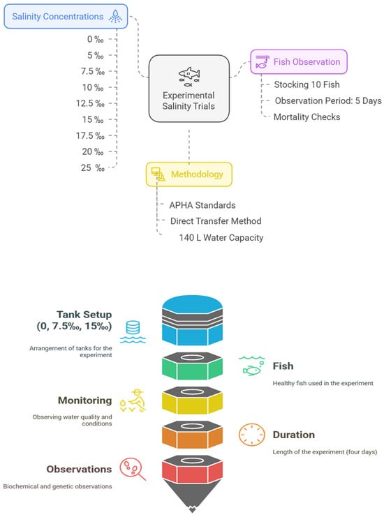 An acute salinity experiment was then set using three indoor tanks, each containing 15 fish of similar size (45 ± 0.1 g), and a total water capacity of 140 L randomly assigned to healthy fish. These tanks represented varying salinity levels: a control tank with 0‰ salinity and two experimental tanks with salinities of 7.5‰ and 15‰, respectively. This acute exposure experiment included three replicate tanks for each treatment group and lasted four days without feeding the fish. Throughout the experiment, water quality parameters and photoperiod conditions were continuously monitored. The desired salinity levels in all 3 experiments were established by dissolving a measured quantity of Haibo reef salt purchased from Jiangxi Yantong Technology in a designated volume of inland freshwater, and their accuracy was subsequently verified using a salinometer. Adjustments were made as necessary to achieve the desired salinity levels. Checks were performed on dissolved oxygen and pH levels, while the temperature was monitored daily (Temperature 22 °C, the dissolved oxygen (DO) at 6.1 ± 0.5 mg/L, and the pH at 7.1, 12 h:12 h light/dark cycle was maintained). Ammonia-nitrogen and nitrate-nitrogen concentrations were measured using a HACH Spectrophotometer, while the standard level of alkalinity and hardness of the saline water were ensured within the accepted recommendation of APHA [33]. Figure 1 displays the whole experiment design.